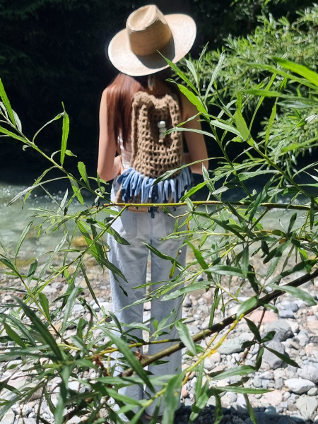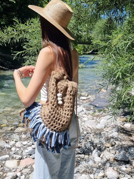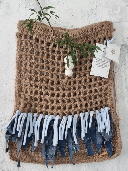 Dieser Turnbeutel aus 100 % Naturjute mit recycelten Jeans & T-Shirtfransen in hellblau vereint Natürlichkeit und Stil. Robust und dennoch leicht, begleitet er dich bei jedem Abenteuer – ob in der Stadt, in der Schule oder am See. Inspiriert von der Kollektion Flussufer, fängt er das Gefühl ein, wenn Sonnenstrahlen auf dem Wasser tanzen und die Natur ihre sanfte Kraft zeigt.