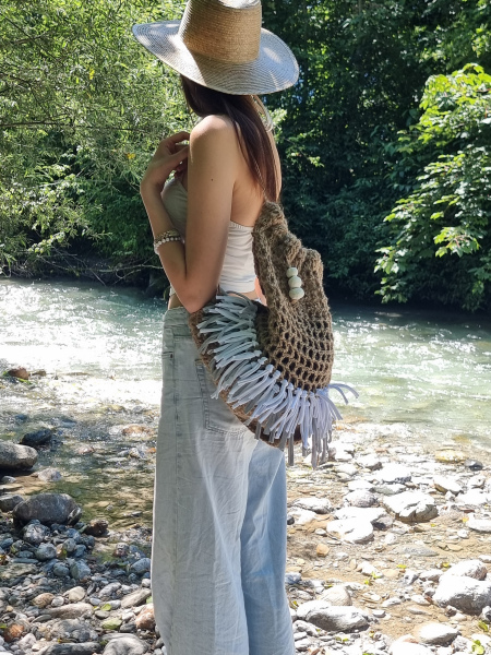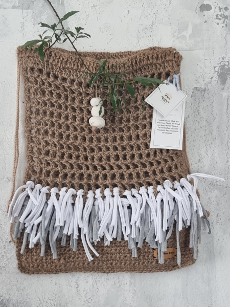 Dieser Turnbeutel aus 100 % Naturjute mit recycelten Stofffransen in weiß und grau vereint Natürlichkeit und Stil. Robust und dennoch leicht, begleitet er dich bei jedem Abenteuer – ob in der Stadt, in der Schule oder am See. Inspiriert von der Kollektion Flussufer, fängt er das Gefühl ein, wenn Sonnenstrahlen auf dem Wasser tanzen und die Natur ihre sanfte Kraft zeigt.